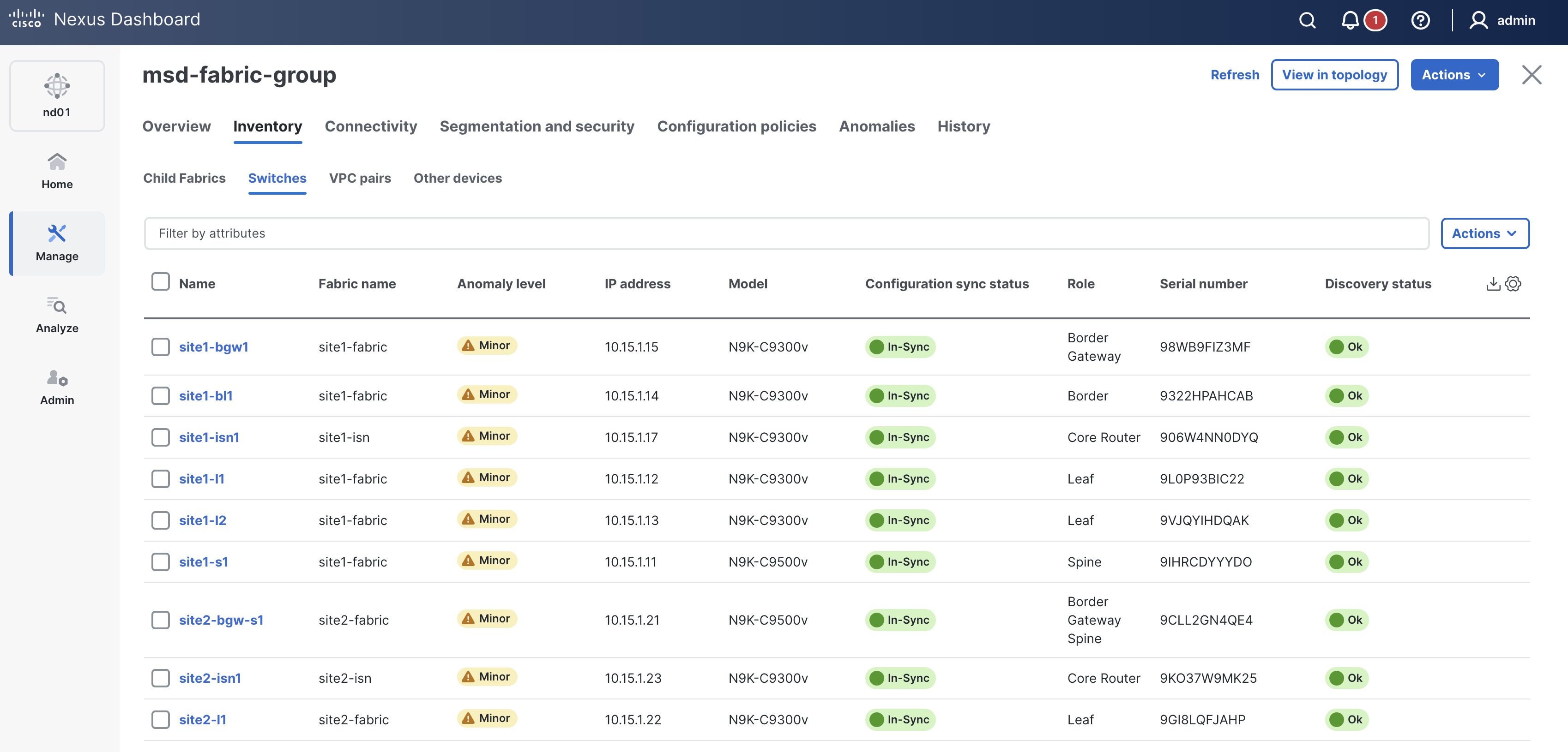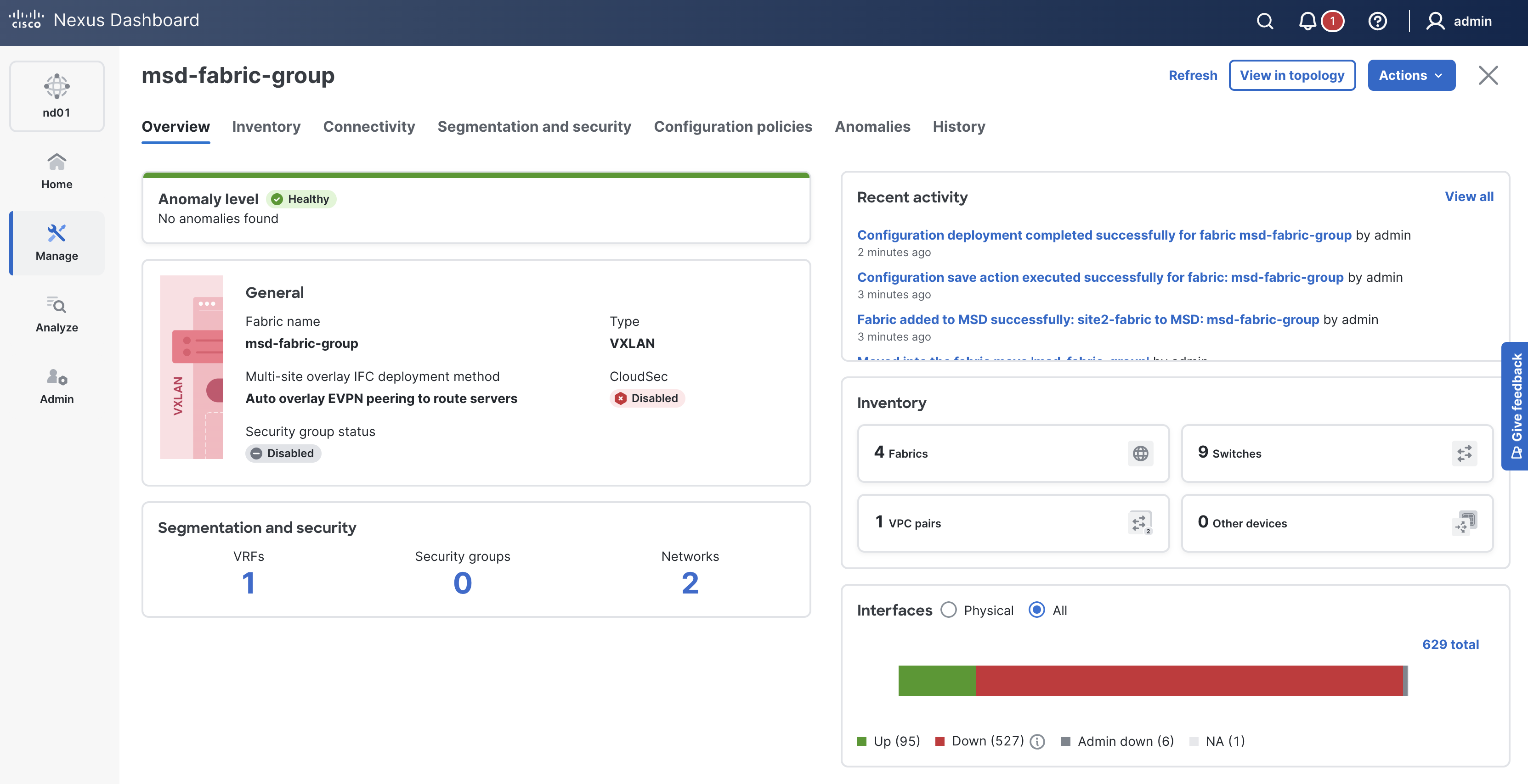Please continue to the next section to start managing your overlay from the Multi-Site (MSD) fabric group level now.