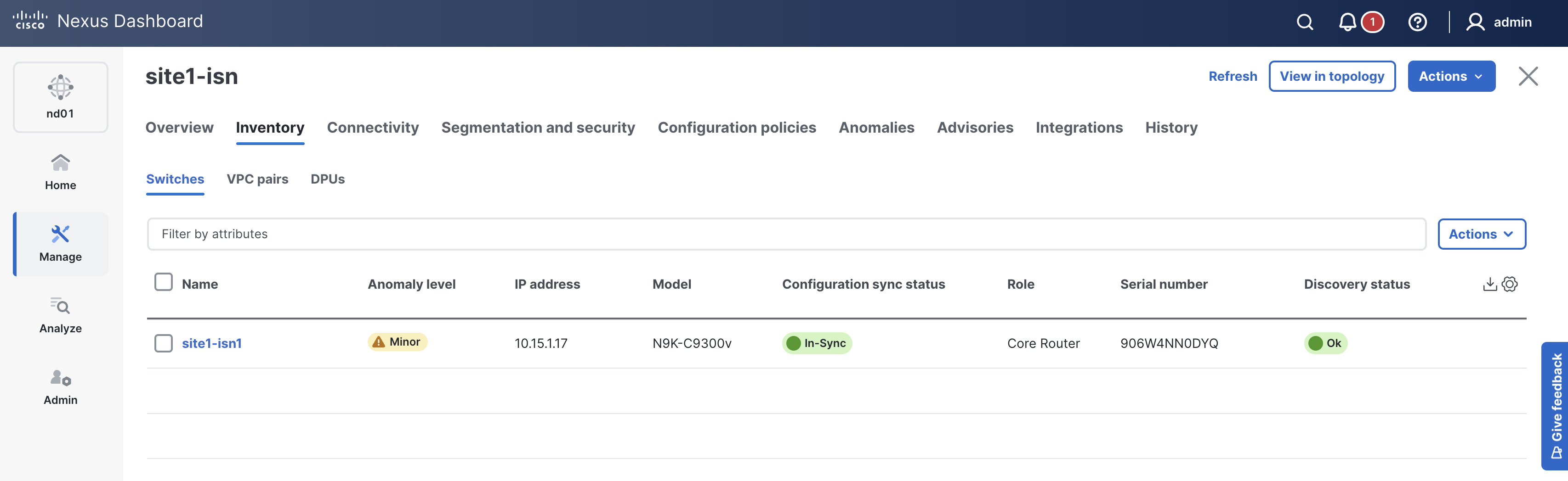 Like previous fabrics, Site1 ISN will leverage the same ND group and ND instance, but specify the Site1 ISN fabric as a logical host.