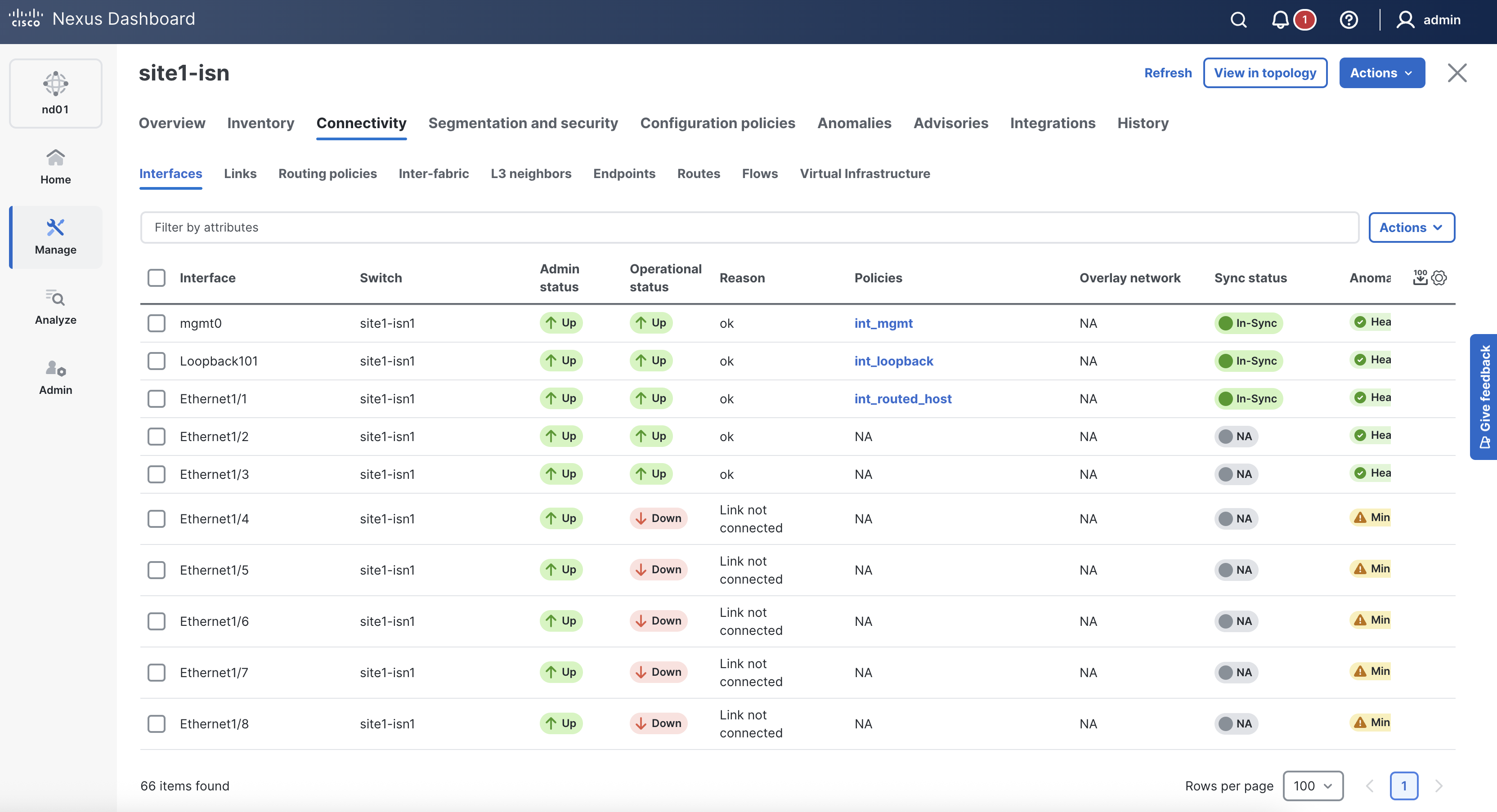 You still define the topology of the fabric switches, interfaces, and policies as before. The interfaces defined on the ISN switch include a loopback interface for the route server and a routed interface to connect to Site2 ISN. In the policy section, an external BGP neighbor policy is defined to peer with Site2 ISN using an ND policy template. With regards to interface Ethernet1/3 in the diagram, this interface is not defined in the data model as the settings you will use for Multi-Site (MSD) will be applied automatically by ND when the Multi-Site extension is enabled later in the lab.