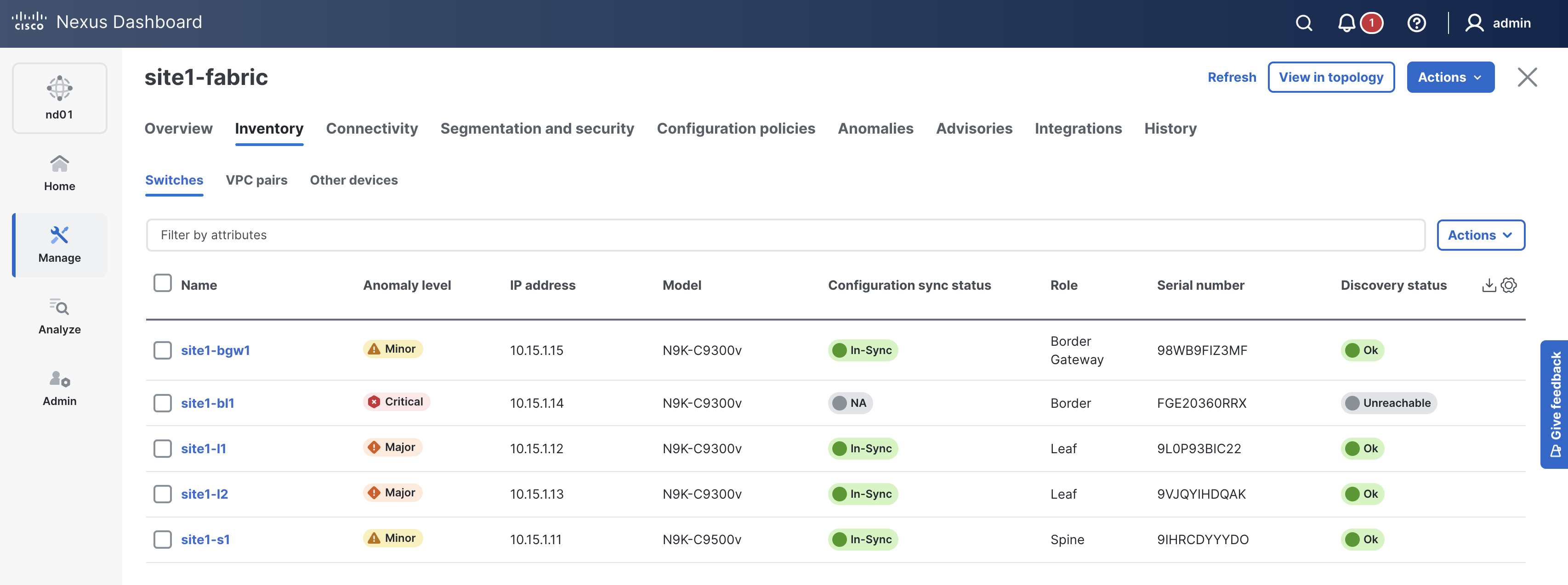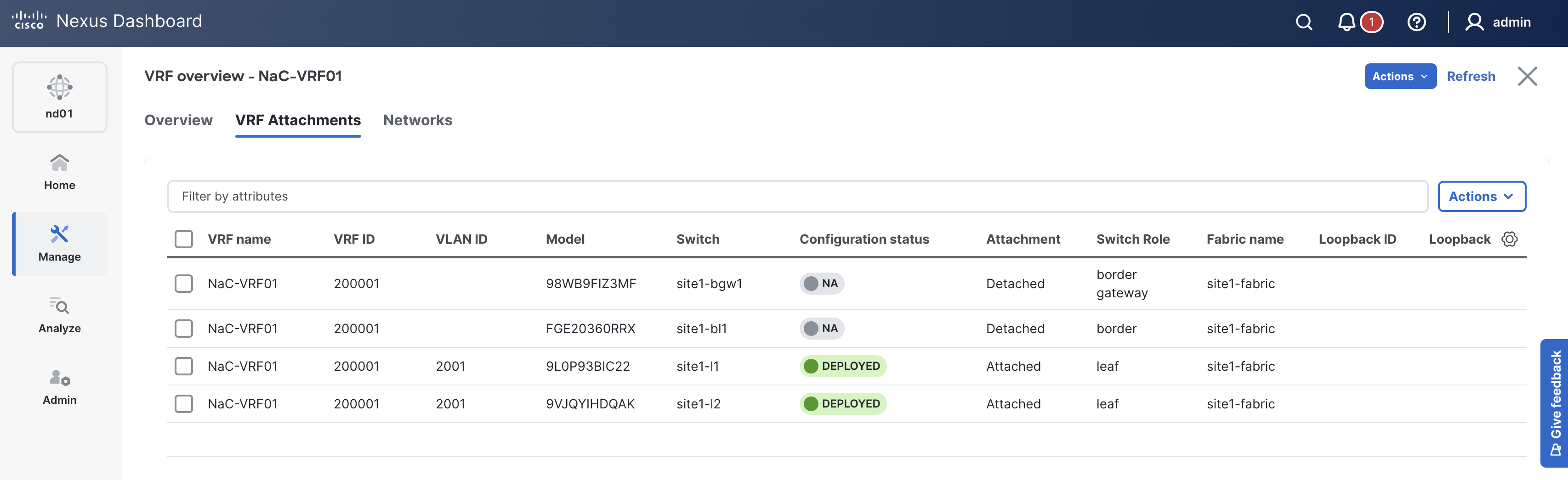 In the next section, you will POAP your pre-provisioned border leaf and complete the fabric deployment by adding VRF-Lite for connecting in and out of Site1.