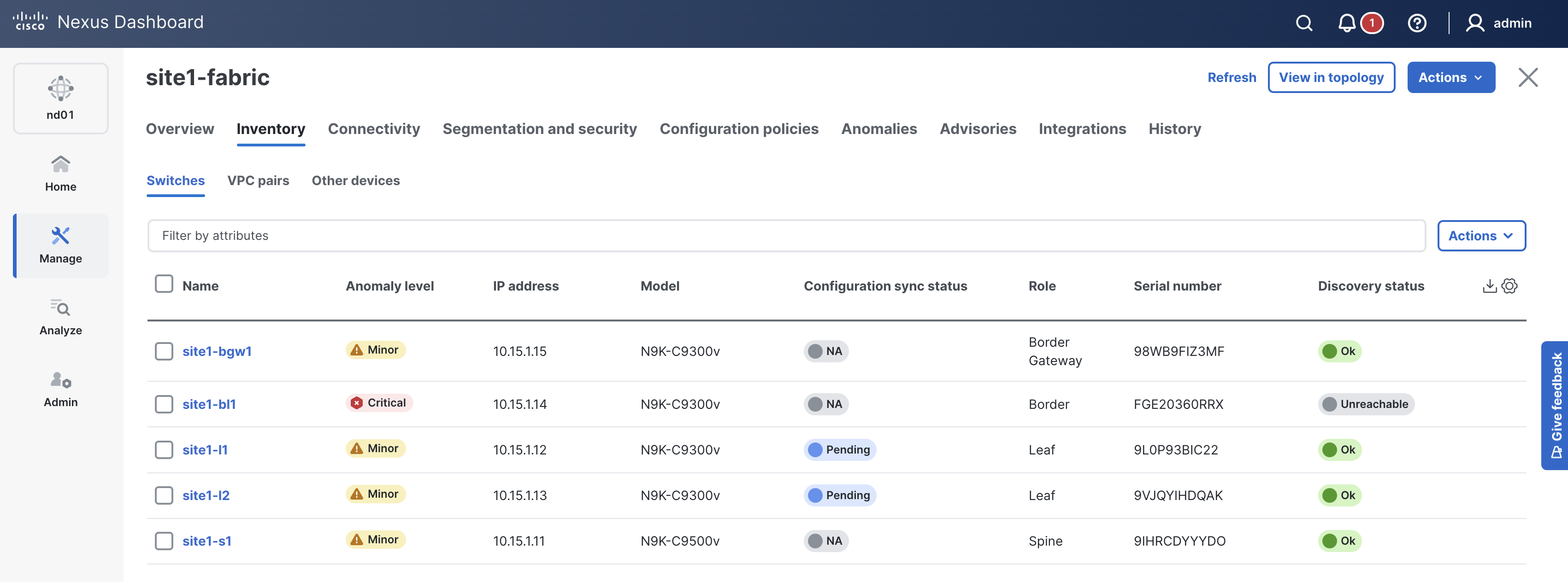 With the devices added to the fabric, you can now create the vPC peering between site1-l1 and site1-l2, using vPC fabric peering. You will create a new file named vpc.nac.yml.