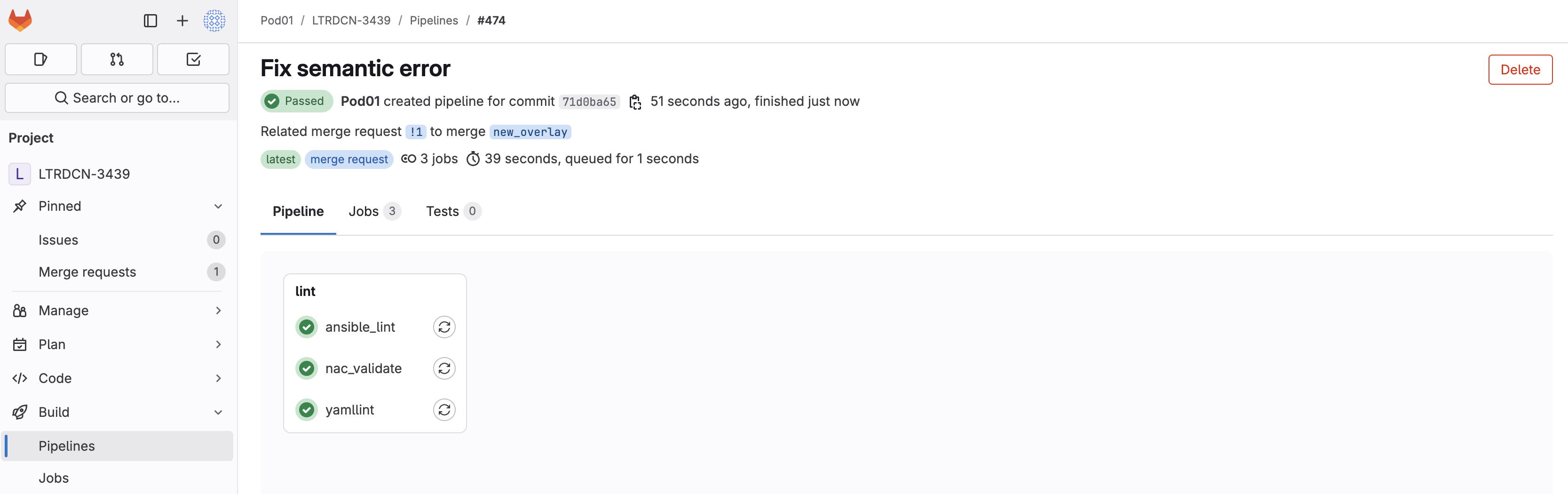 As soon as the code was committed to the new_overlay branch, Ansible Lint validation was triggered. Return to your GitLab and navigate to Pipelines: