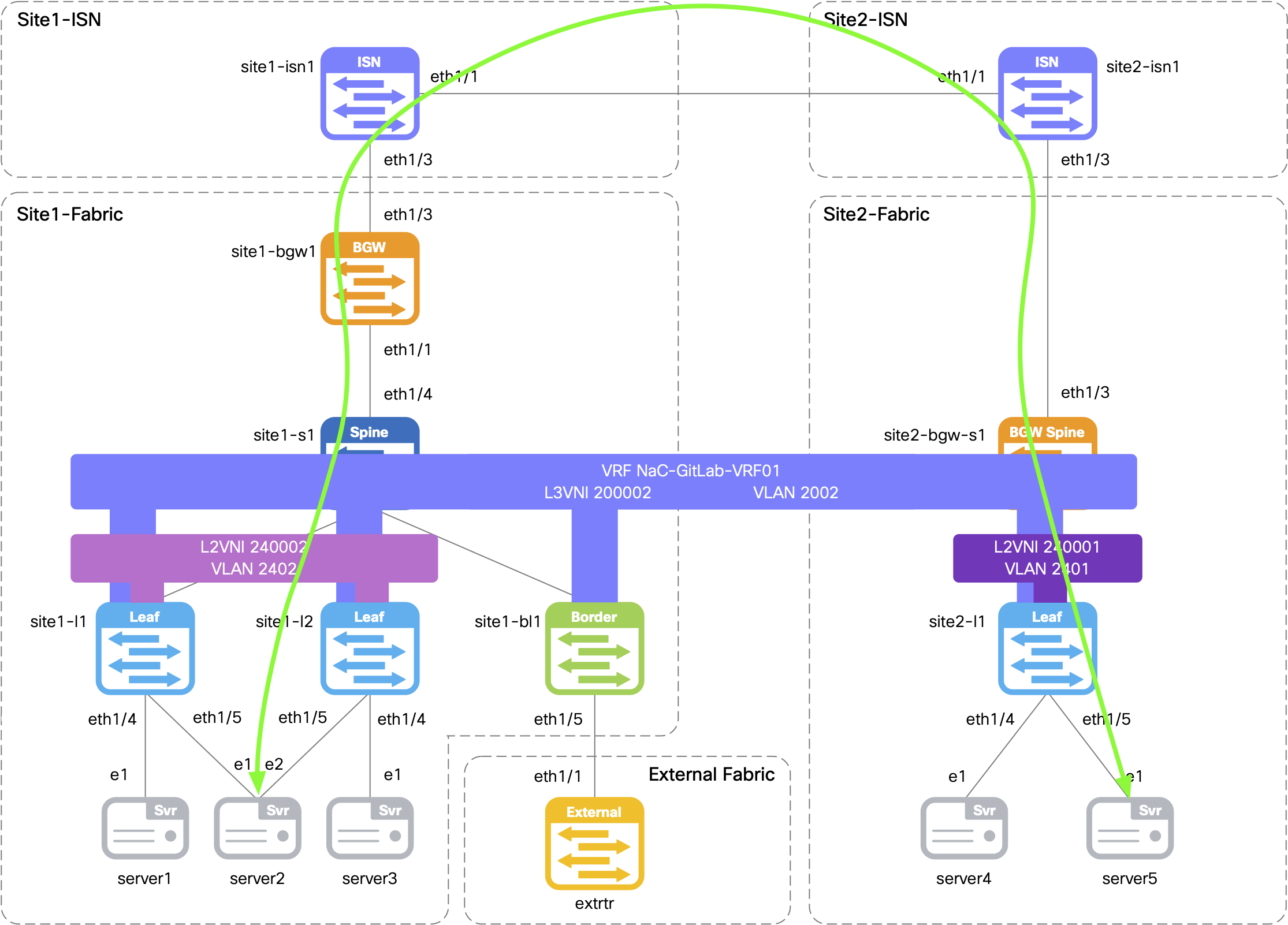 Return to your terminal window and connect to Server5 located in Site2 to verify connectivity over the Multi-Site overlay to Server2 located in Site1.